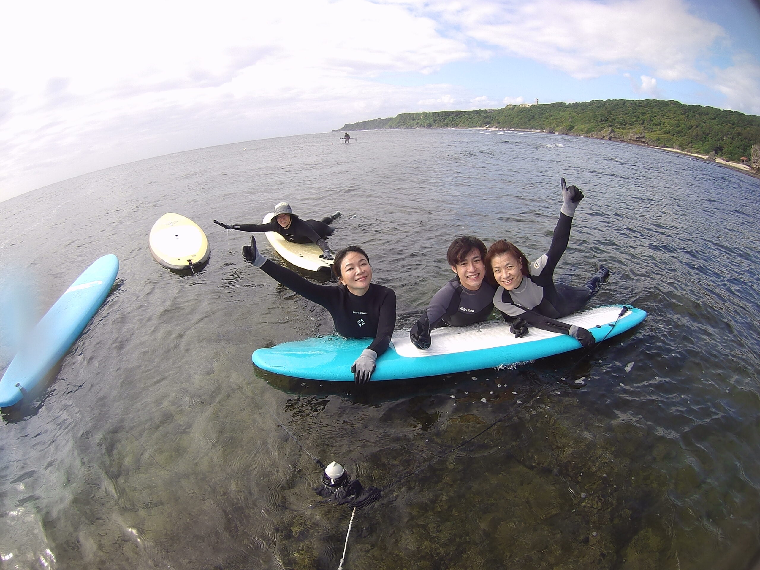 「scary!scary!」「I did it. I can!」沖縄のサーフポイントはほとんどがリーフですので、下が岩やサンゴとなっおります。初めてのサーフィンで怖がる方、波に乗れて大興奮の方もいました。