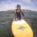 「どうかなー…。」スタートは少し不安そうな感じでしたが、何本か小波に慣れてもらって、少しづつ大きめの波にもチャレンジしました。最初はうまく乗れませんでしたが、後半には少し立つこともできました!